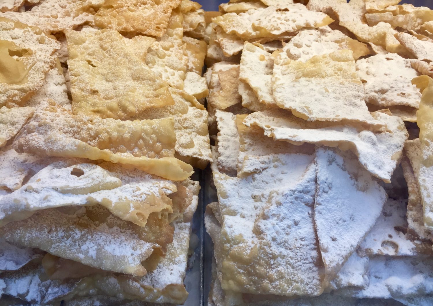Impastate tutti gli ingredienti, stando attenti a non creare grumi, fino ad ottenere un impasto morbido ma che non si attacca alle mani (o alla ciotola se utilizzate la planetaria). Se risulta troppo morbido, aggiungete della farina un po’ per volta. Terminate impastando un po’ a mano, avvolgete nella pellicola per alimenti e fate riposare per almeno 2 ore. Ora tagliate la pasta in più panetti e la dovrete lavorare come si fa con le lasagne: stenderla sottile, ungere la superficie e piegarla, poi stenderla ancora e piegarla. Questo passaggio andrà fatto almeno 2 o 3 volte, facendola riposare. Infine, stendete per l’ultima volta la pasta sottile sottile e create le classiche incisioni al centro della losanga. Friggete in olio bollente e, una volta raffreddati, spolverate con dello zucchero a velo.