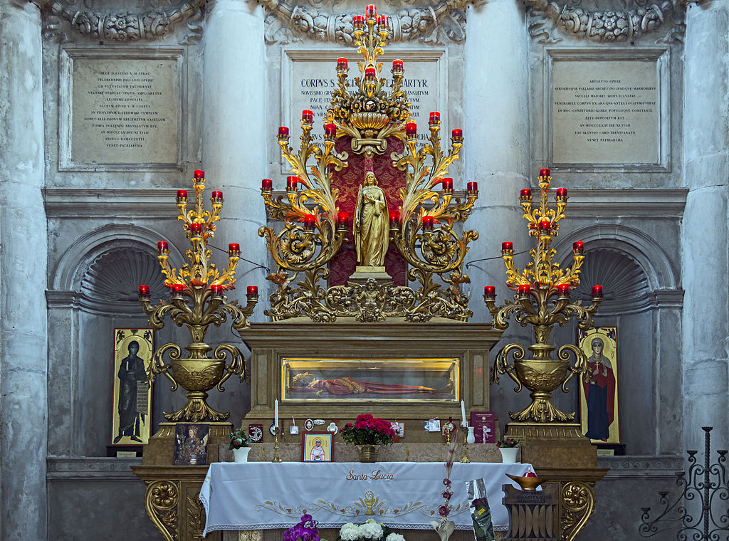 Secondo alcune fonti nel 1204, quando i veneziani conquistarono la capitale bizantina Costantinopoli, trafugarono il corpo di Santa Lucia e lo portarono a Venezia (anche se non c’è certezza che il corpo sottratto sia proprio quello della Santa siracusana, altre fonti infatti sostengono che il corpo di Santa Lucia sia custodito a Metz, in Francia).